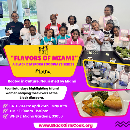 Flavors of Miami: A Black Diaspora Foodways Series is a four-Saturday program for girls ages 8–15 that celebrates the vibrant culinary culture of Black Miami. Led by inspiring Black women from Miami whose work honors the legacy of the Black Diaspora, participants will explore hands-on cooking, taste culturally rooted foods, and experience the stories, traditions, and creativity that shape Miami’s rich food landscape. This cohort provides a unique opportunity to celebrate heritage, build confidence, and deepen understanding of how culture and cuisine are connected.